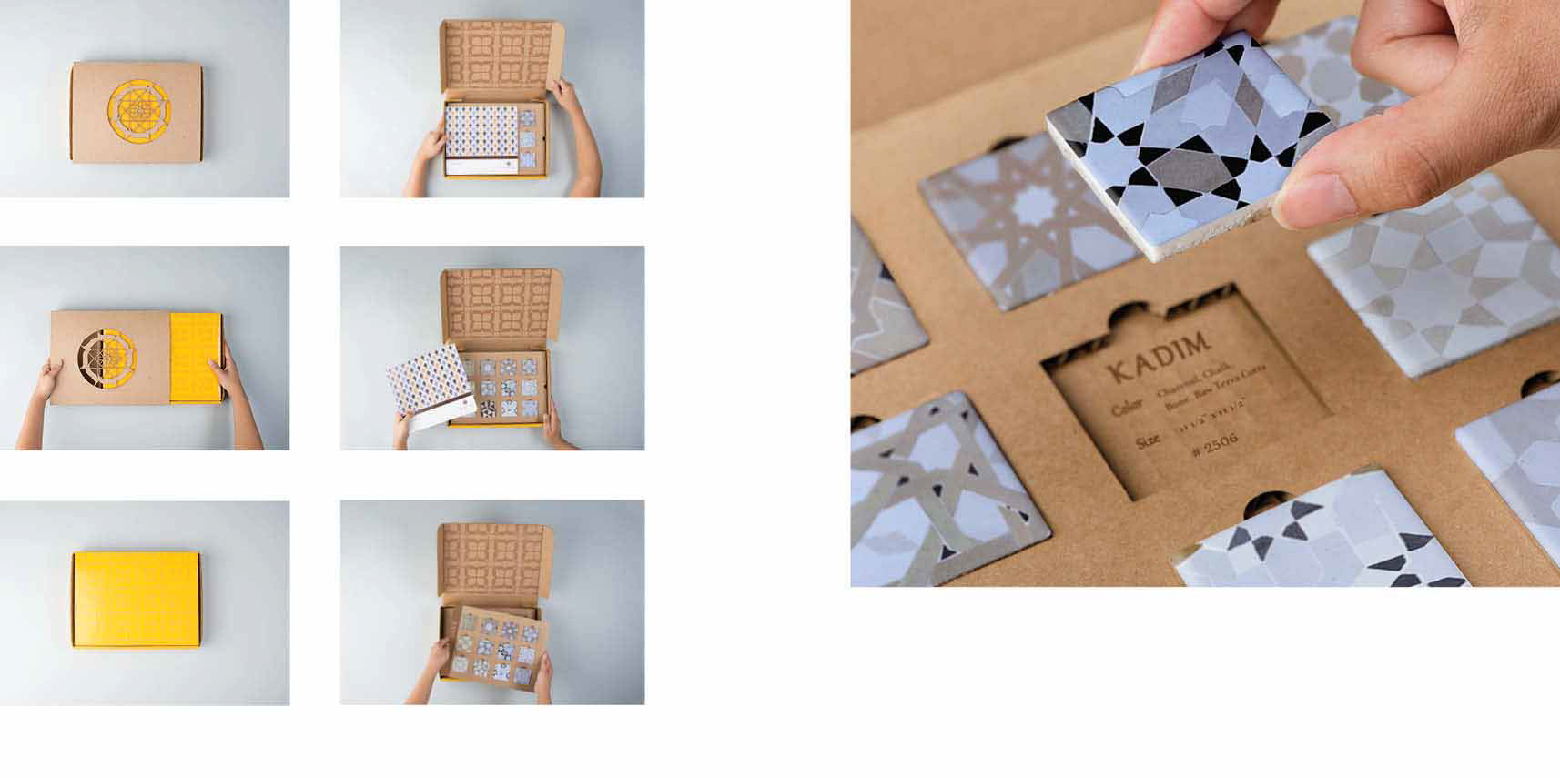 Taking inspiration from Middle Eastern calligraphy, I created a custom typeface with high stroke contrast and geometric forms that was used in the logotype and mark. The unique shape of the letterforms was also used to create patterns that I used throughout the brand. A neutral color palate of yellow, natural kraft, and navy allowed the color of the tile to shine. I used Filosofia as a main text typeface for its delicate refinement, paired with clean sans serifs for use in information-heavy areas. The packaging system uses special finishes such as die cutting and etching to deliver on the premium look.