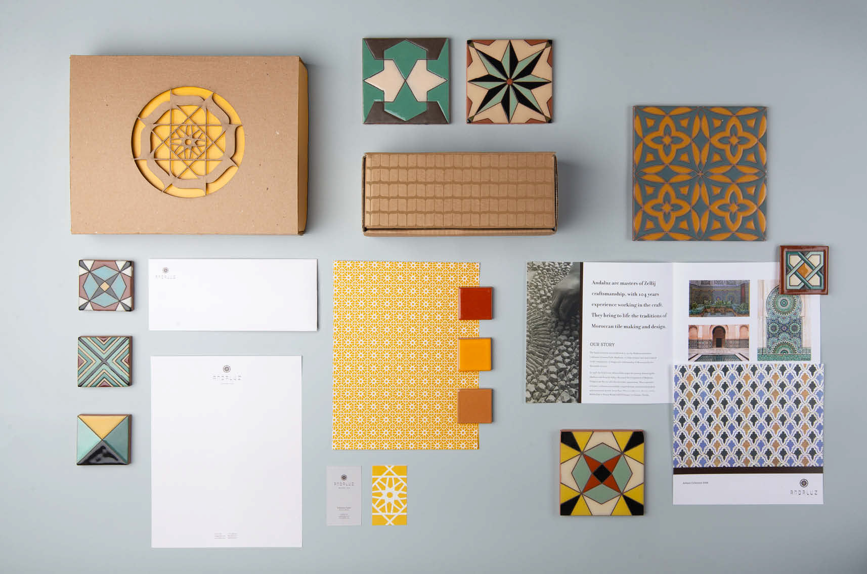 Andaluz is a line of premium tile, created in a Zellij style. The geometric tiles, which are handcrafted by artisan workers, are a staple of Moroccan architecture. Andaluz needed a new brand and packaging system to deliver its tile with Moorish sophistication. The brand targets wholesale clients including high-end home showrooms and interior designers.