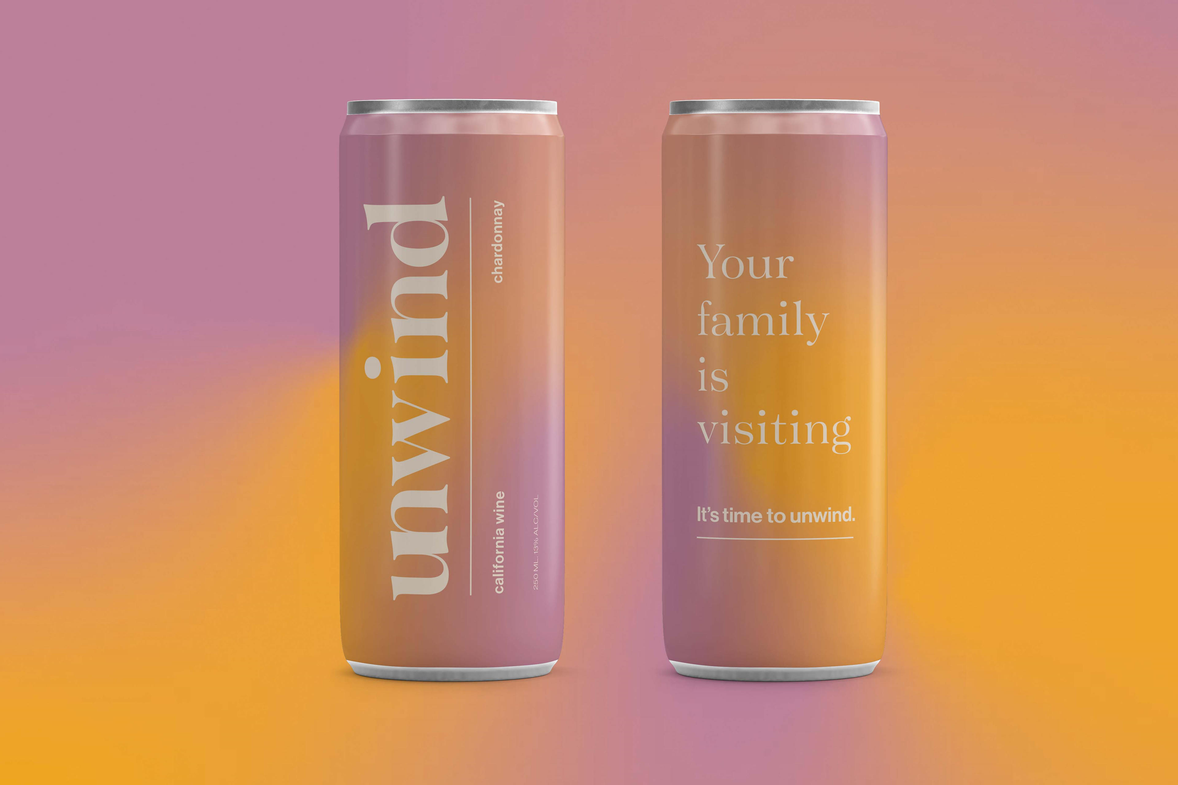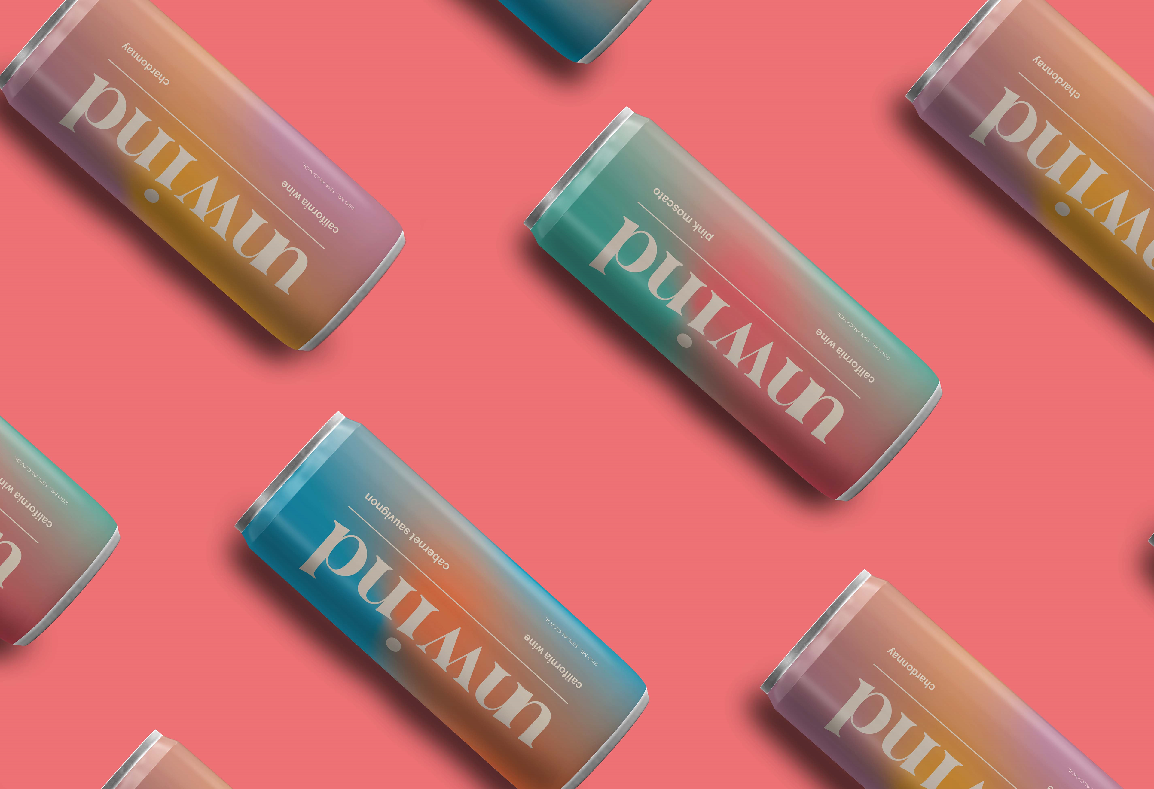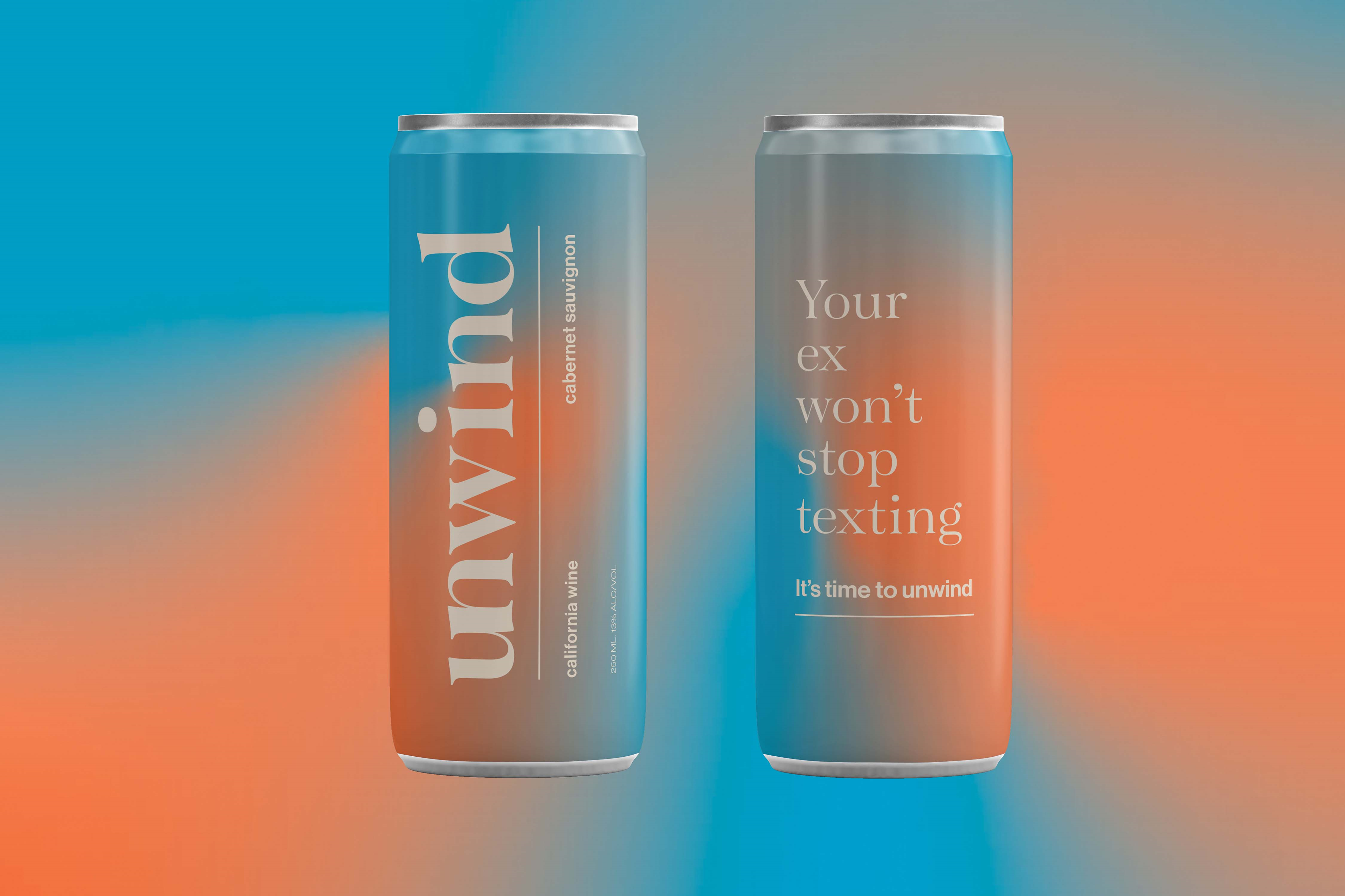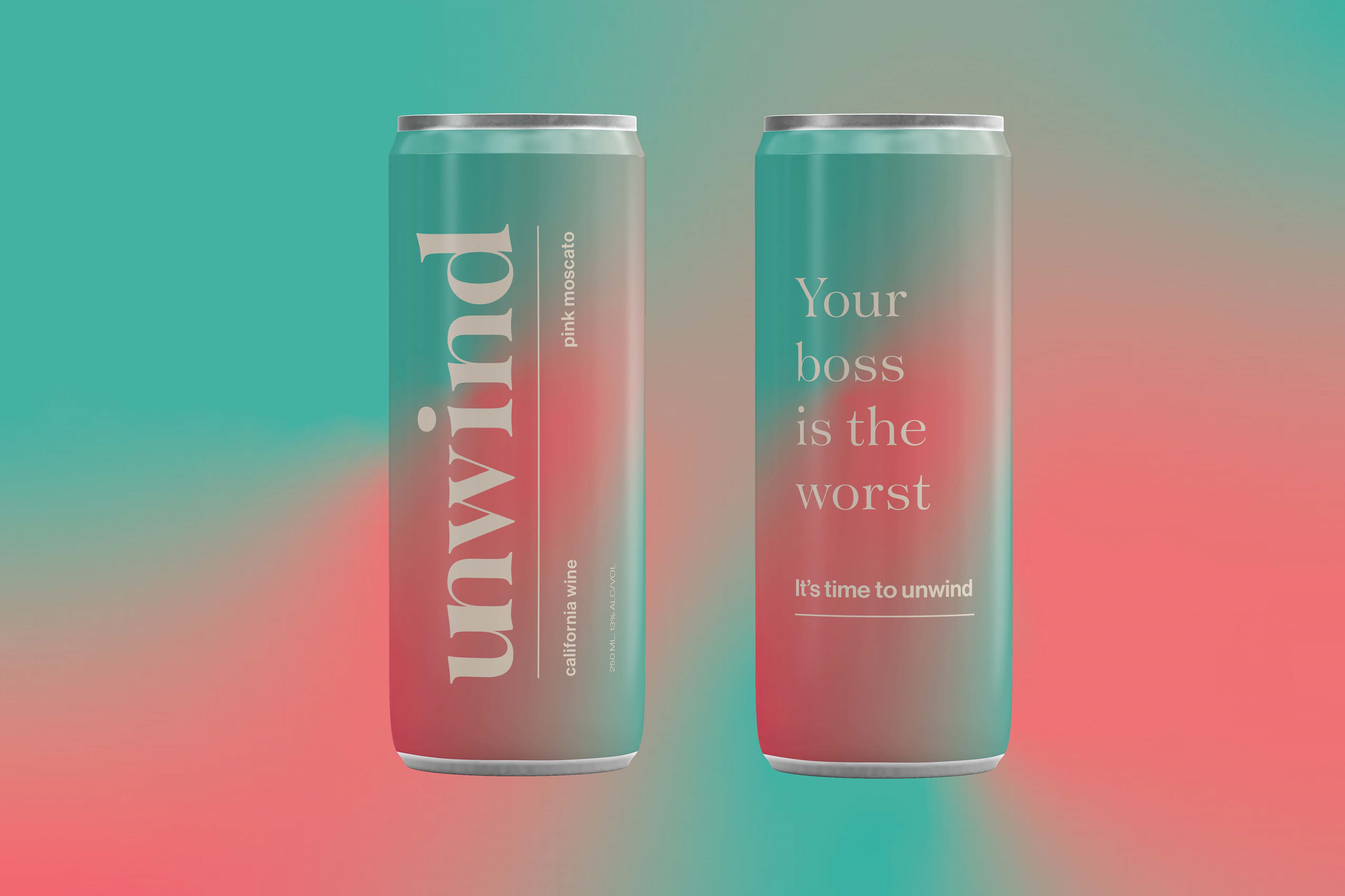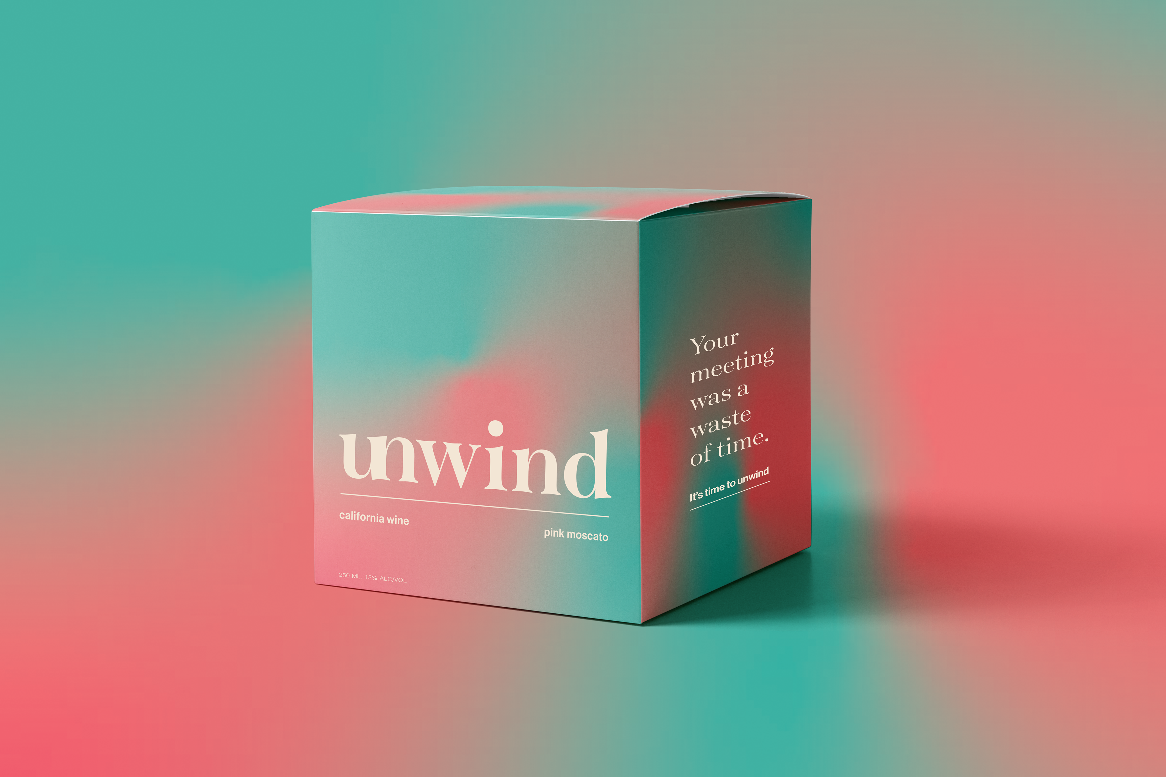 Unwind was a concept packaging design for a canned wine company. Its target audience was women in their late twenties to earlier forties who after a hard day want a glass of wine to relax and talk to their friends. It uses cheeky copy and tranquil gradients to connect with its target audience. The typography was chosen to give an approachable but slightly higher end feel to it. Unwind was meant to go against the idea that canned wine is cheap and unpolished.